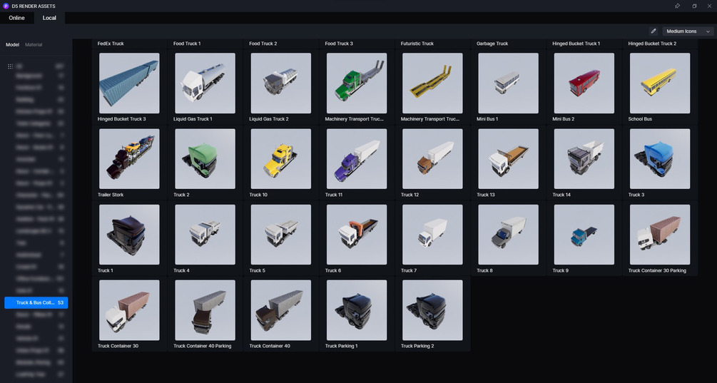 We selected the 53 most essential models of the Trucks and Bus to create urban renderings quickly and efficiently.